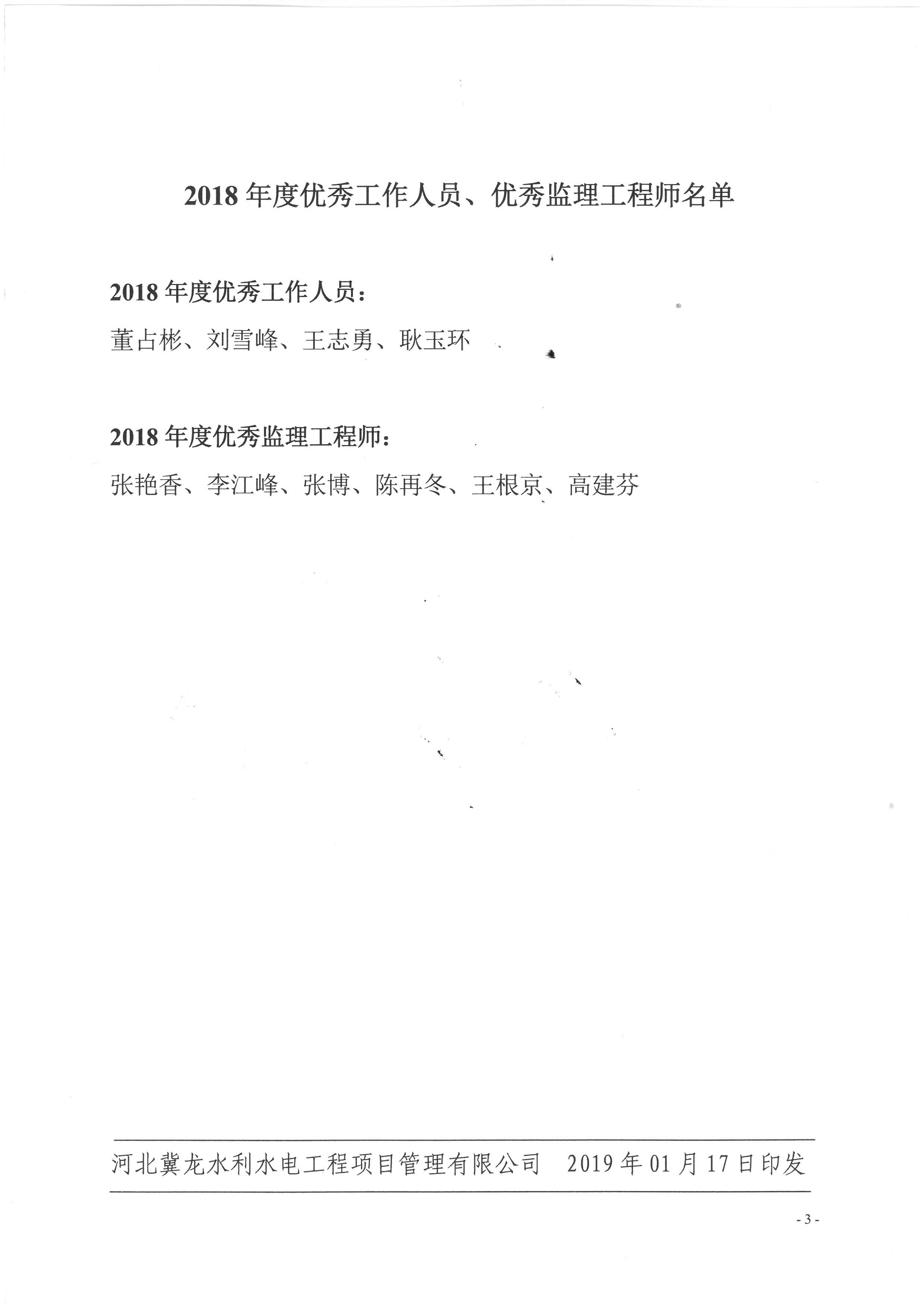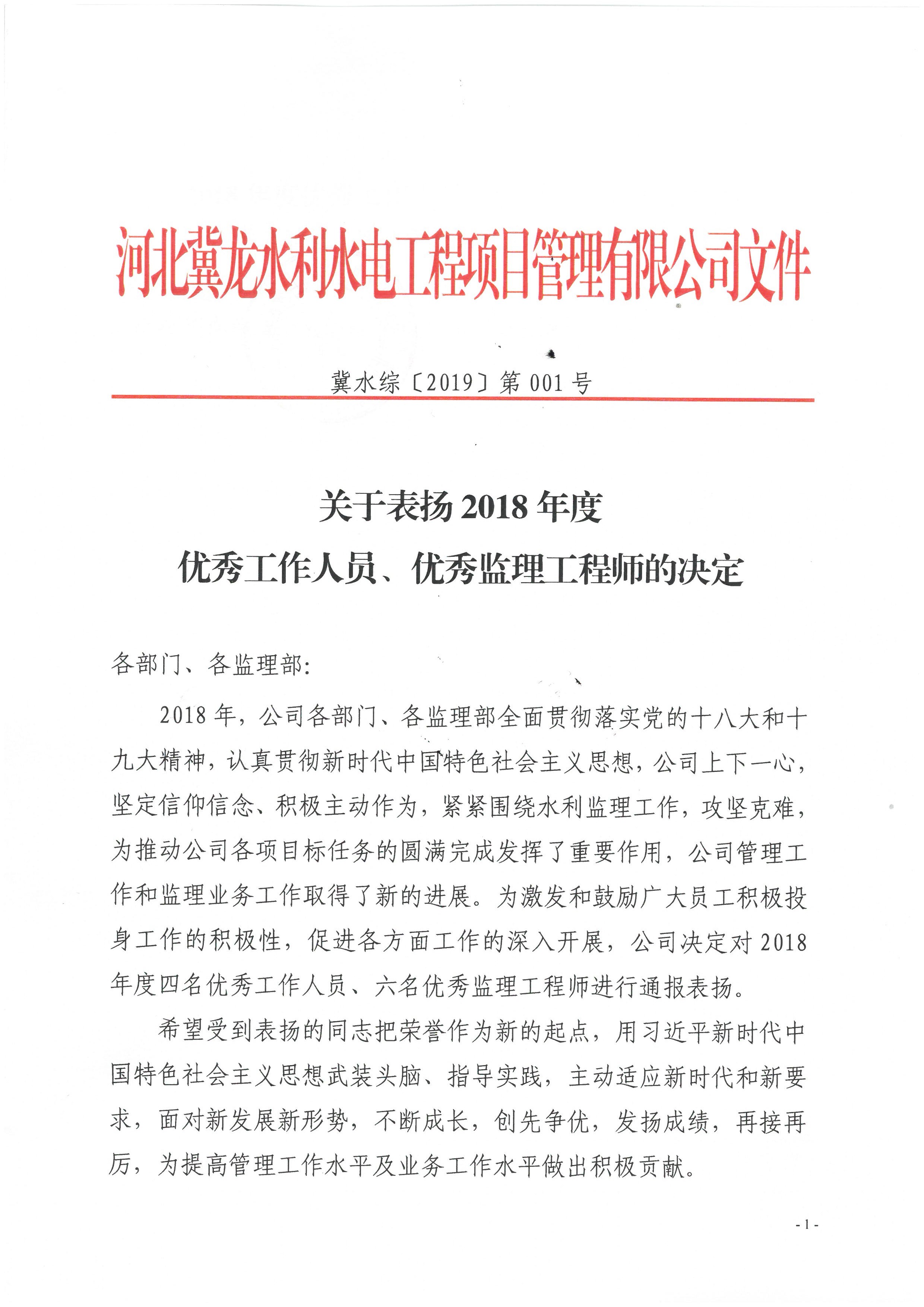 關(guān)于表揚2018年度優(yōu)秀工作人員、優(yōu)秀監(jiān)理工程師的決定